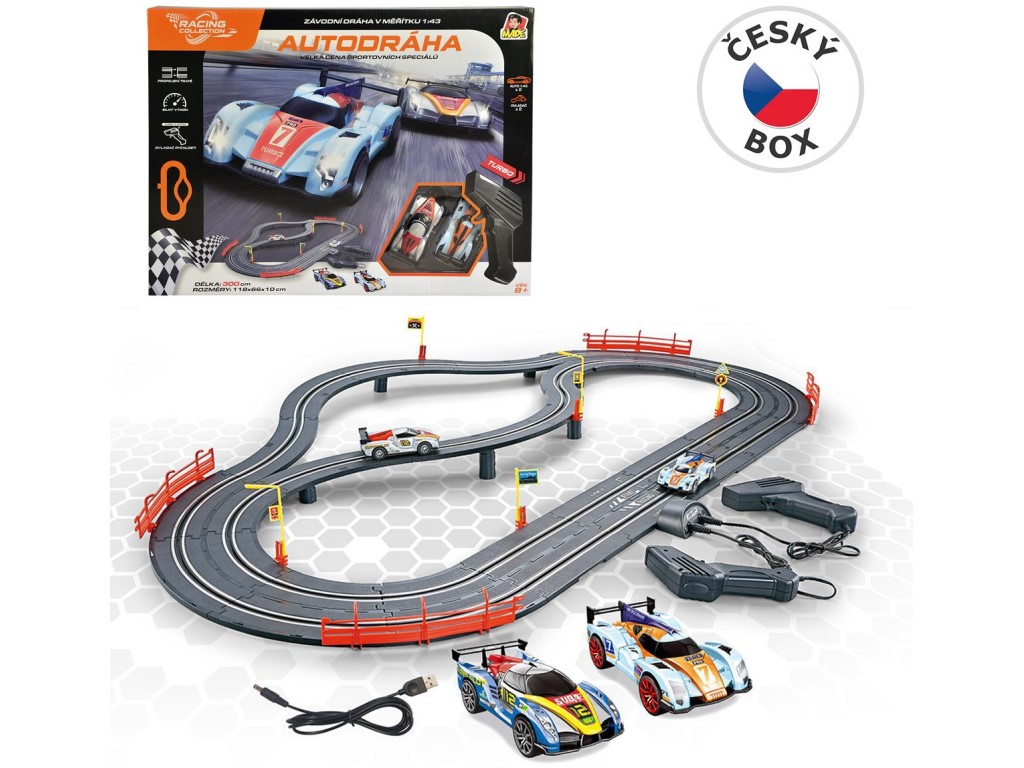 Autodráha je skvělou zábavou pro děti co mají rády rychlou jízdu pro všechny malé i velké závodníky. Autodráha z produktové řady Racing Collection obsahuje 2 auta závodní speciály, 2 ovladače, s USB kabelem pro externí napájení, s mostem a s příslušenstvím, délka trati 300 cm. Baleno v českém boxu. Napájení: USB kabel pro externí napájení (zdroj není součástí). Rozměr: 118 x 66 x 16 cm. Vhodné pro děti od 8 let.