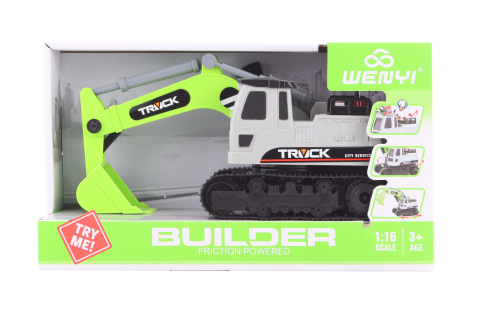 Bagr zelené barvy. Může se pohybovat dopředu i dozadu a má otáčivou kabinu. Po vložení baterií vydává zvuky. Napájení na 3 baterie AG13 (jsou součástí balení). Rozměry auta cca 26 x 12 x 13 cm. Rozměry balení cca 32 x 18,5 x 12 cm. Věk 3+