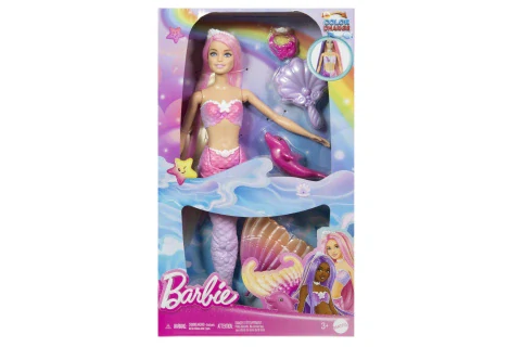 Tato panenka Barbie® mořská panna inspirovaná filmem Barbie® a dotek kouzla dodává hrám kouzlo díky možnosti proměny barev! Jako by ji očarovala podmořská magie, její super dlouhé vlasy, tvarovaný živůtek a ombre ocas mění barvy z růžové jako žvýkačka na tmavě fialovou. Je navržena s krásnými detaily od hlavy až k patě a patří k ní také stylingové doplňky, kartáč a roztomilý mazlíček z oceánu! Panenka Barbie® nemůže plavat ani stát samostatně. Barvy a provedení dekorací se mohou lišit. Věk 3+