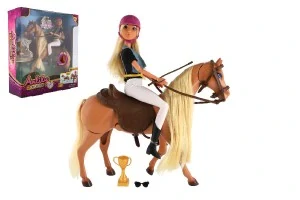 Všechny malé milovnice koní potěší panenka žokejka s koníkem, který má dlouhou hřívou a ocas. Panence nechybí jezdecké oblečení a helma. Koník má sedlo a uzdu a hýbe hlavou a končetinami. Rozměry balení 32 x 36 x 11 cm. Vhodné pro děti od 3 let.