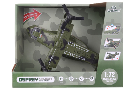 Plastové vojenské letadlo na baterie. Po stisknutí tlačítek vydává zvuky a svítí. Rozměry cca 32 x 22 cm. Rozměry balení cca 29 x 23 x 9 cm. Napájení na 3 AG13 baterie (jsou součástí). Rozměry balení cca 31 x 24 x 11,5 cm. Věk 3+