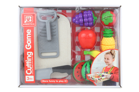 Plastová sada ovoce na krájení. Jídlo je uvnitř spojeno suchým zipem, lze ho krájet (oddělovat) opakovaně. Děti se tak učí správnou motoriku. Balení obsahuje celkem 6 kus ovoce, prkénko, nůž, škrabku a struhadlo. Rozměr balení cca 30,5 x 24,5 x 6 cm. Věk 3+